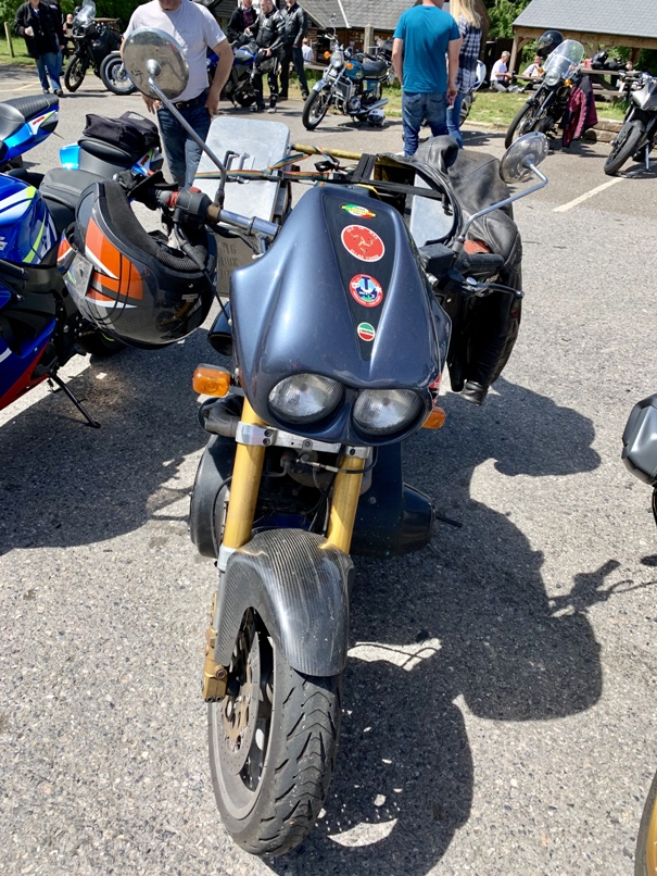I later talked with visitor Nick who said he’s seen an Enfield complete with a Nissan Leaf electric motor up at John o’ Groats one time. Apparently the bike had come up from Lands End on some kind of endurance run but had to be charged up every 50 miles or so. We’d like to see this bike in person and anymore self built electric motorcycles, so if you have constructed one, do bring it to the next rally please!It was nice to see Abel Josselin return to the Big Knock, this time on his magnificent creation, a machine I’d last seen in Hamm back in 2016. Anyone who’s read the report of that particular rally will know his bike sports a 1.6d Mk2 Golf engine. Gearbox is a later Mk4 unit. Full details here.