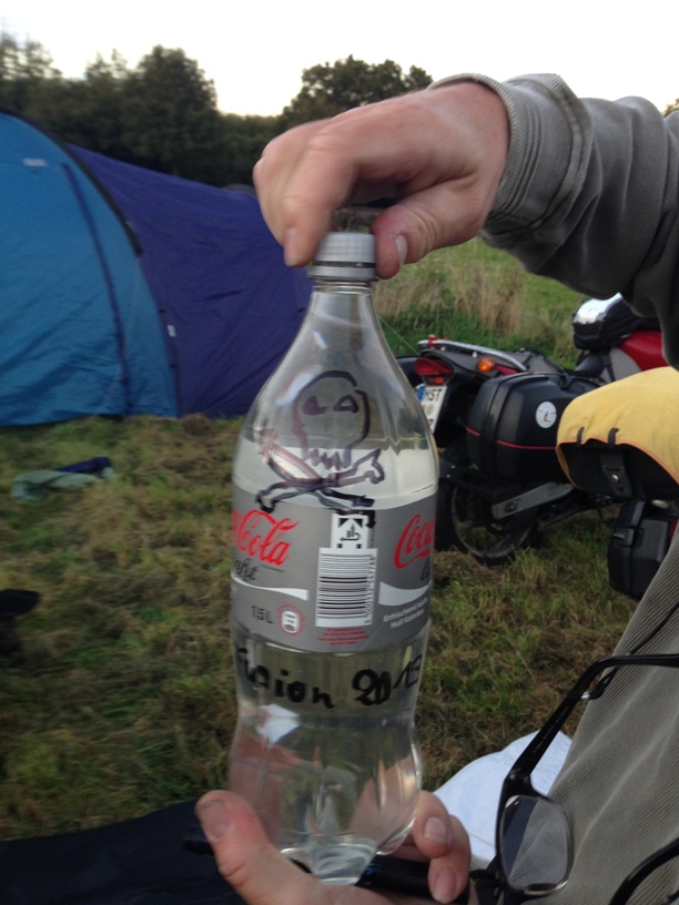 Andreas proudly declares this 'brew' to be the result of his gatherings from the Fusion festival. It slowly dawns on us that we have drunk a concoction of hundreds of leftovers and that our friend has been engaged in doing something that we, in our youth, called 'minesweeping'. Urgh! See a picture of this down the page.