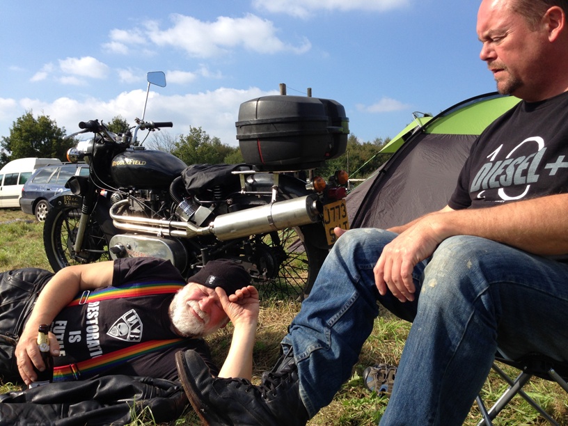 Friday sees the arrival of a Smart Motorcycle ridden by Andreas and he decides to pitch up next to Jeff and myself over on the far side of the green. We stride across the event field to shake hands and after the introductions to himself and his partner we are told a story to send chills up the spine of any motorcycle tourer.