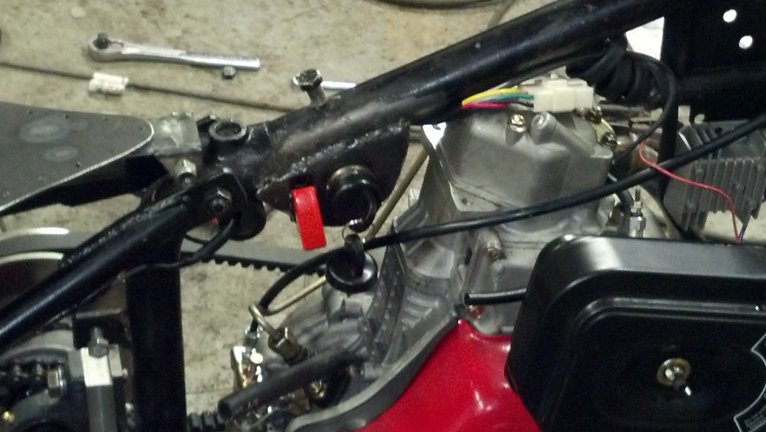 A piece of the upper frame gusset tube was removed and welded back in at an angle to allow clearance for the top of the engine. A switch plate was welded to the frame and uses the switch that came with the engine for the electric Start and Aux. power.  The output from the Aux. power is run through the toggle switch and connects power for all the lighting.  The reason for this is I wanted to be able to crank the engine before turning on the lights, the engine requires a lot of current from the battery to start and I did not want any systems running during start-up.