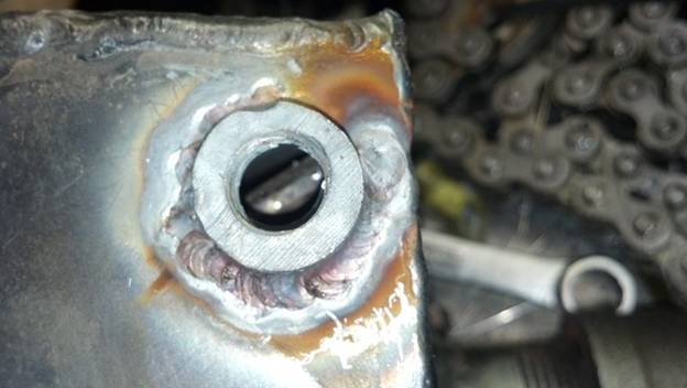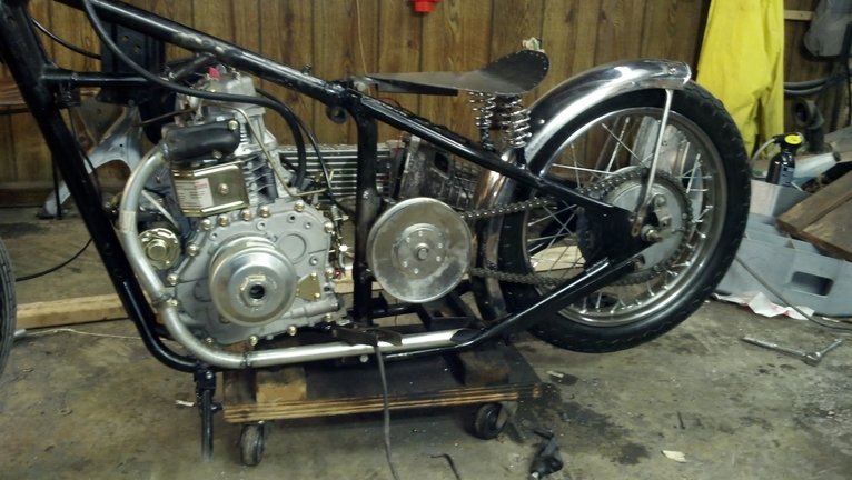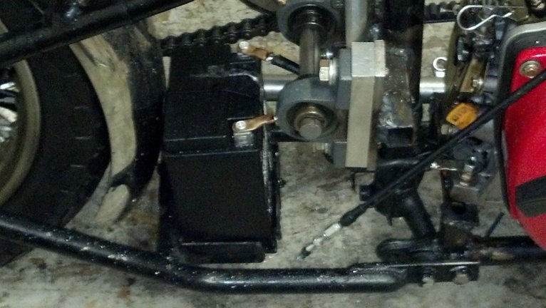 The jack shaft setup:  a 1x1x1/8” piece of mild steel was notched and welded around the vertical frame tube.  3/8” mild steel plates tapped for 1/2x13tpi were welded to the tube.  The original crankshaft-jack shaft spacing was 12” on center, comet does not make a belt in this size so a ~5/8” aluminum spacer was cut to increase the on center length to 12 5/8” which is a belt size offered.  The jack shaft is Ύ” with 3/16” keyway.  The shaft was shortened and groves for c-clips were cut into the ends of the shaft.  The pillow block bearings were sourced from an industrial supplier and mounted to the mounting points using Grade 8, 2x ½”13tpi bolts with lock washers and flat washers. Moly Grease was and is added to the bearings at intervals to ensure longevity.  11, 12, and 13 tooth 50 series sprockets with Ύ” bore and 3/16” keyway were sourced from the same supplier along with a 50 series roller chain and master links.  The 12 tooth is currently mounted to the shaft.  The original sprocket in the rear is a 50 series sprocket and worked out great.