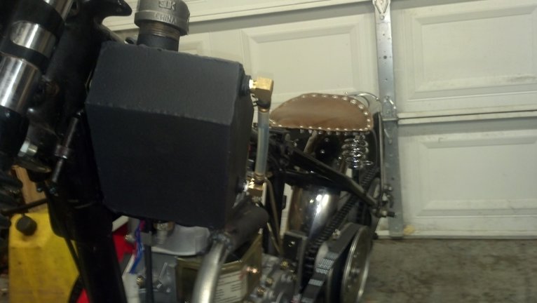 The tank, seat, and taillight bracket were constructed:  Tank using 18 ga I believe, I looked up what the DOT requires for min. thickness and used that.  The tank has a pipe fitting for the filler and cap, Ό npt bungs for the fuel exit and sight fittings, and a 3/16 tube that runs from the bottom to the top of the tank for the fuel return from the injector.  The tank was pressure tested, welded pinholes and coated in SEM rubberized undercoating.