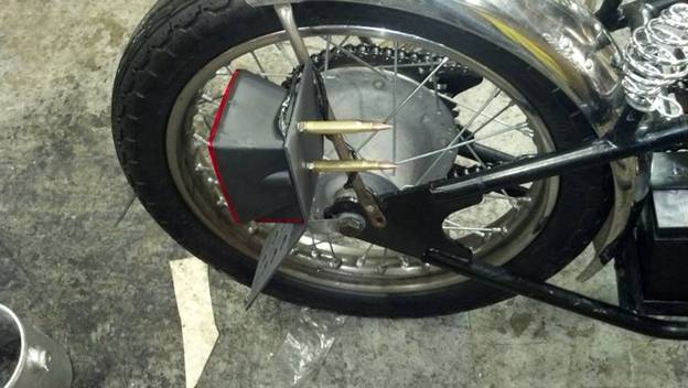 The taillight bracket was cut and bent 1/8” mild steel with holes drilled to reduce weight.  The rear light mounting bolts had the addition of some 30-06 rounds with threaded primer pockets.