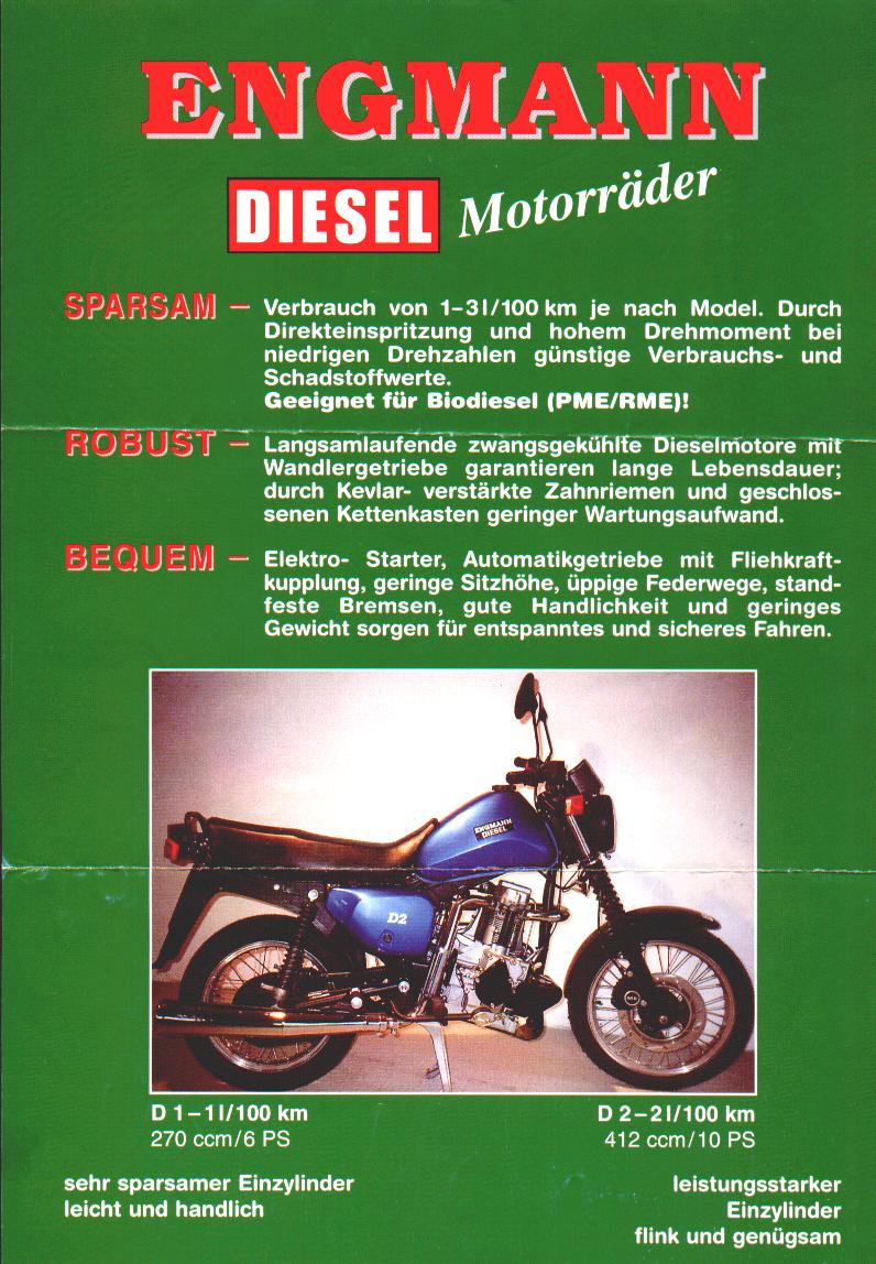Engmann seem to have produced and offered several Diesel Motorcycles down the years, the MZ framed bike being the most prominant. Click here and here to see different pages of a magazine advert (german text) offering both Ruggerini 850cc and Robin 412cc bikes. Notice that Engmann has tilted the Robin engine in an effort to reduce vibrations. Niether of these machines are still being made, Engmann having died some time ago. The D3 means the bike requires 3 litres of Diesel to travel 100 km.