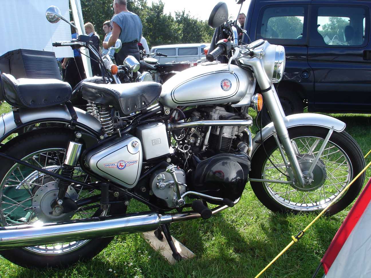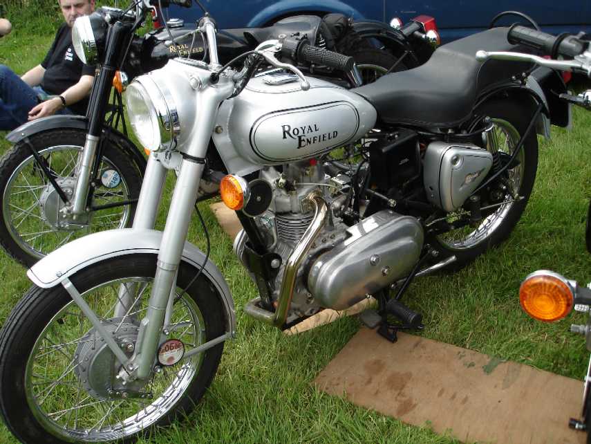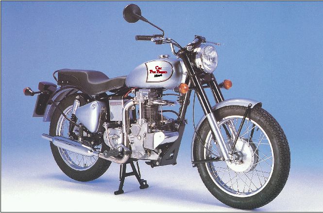 Enter the HATZ!!! Again we see the trusty Royal Enfield Bullet, this time fitted with a German made 350cc direct injection HATZ 1B30 Diesel engine. With 1:22 compression, electric start and good cold start performance this bike is just the thing if you aim to travel on the cheap with fuel consumption at 170 m.p.g. The engine produces 9 b.h.p. and is governed to around 3800rpm. New bikes retail at £4250 from CHARNWOOD CLASSIC RESTORATIONS. They'll even fit an engine in your old Bullet for around £1999. Can't be bad. See below for more contact info.