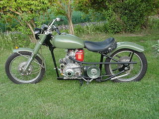 We bored holes through, bolted in bearing assemblies then cut our own shafts. We custom built the lower frame and the jackshaft drive case. I uses 10hp Sterling diesel engine. I run cooking oil in it. The tank is from a sportster, the drive from Comet and we bought the pulleys from a bearing distributor and other parts are from an industrial vacuum. We call it Mutt. It's not fast, but it's a whole lotta fun. Plans for fall/winter include five speed from a Kawasaki, stretching frame with a lowered seat, and build custom front end. I average about 110 miles to a gallon.