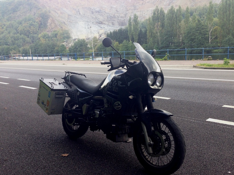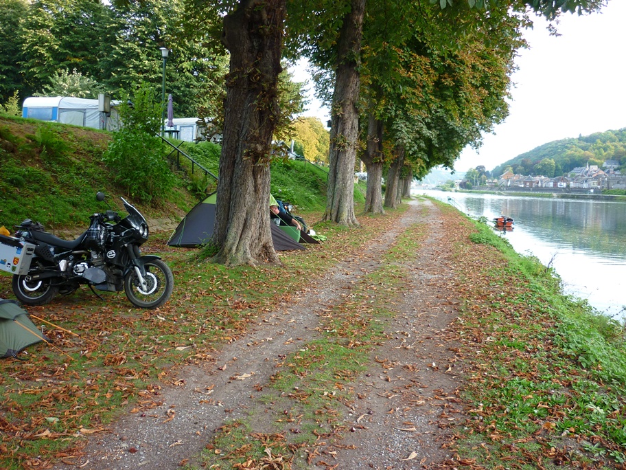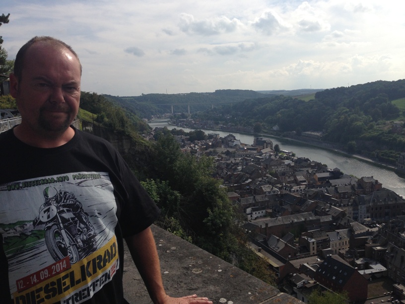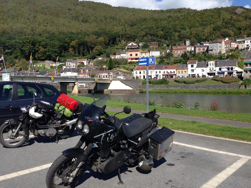 We flashed past more settlements and the industrial areas that lined the flowing waterway and eventually rode into the thriving town of Dinant. Here we parked up besides a riverside coffee bar and ordered drinks. Nearby bikers took an interest in our diesel powered machines and we spent a few minutes explaining the workings of them in broken English.