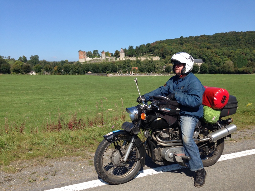 We followed the N96 and the long curves of the river until the road joined with the D989 and crossed the river. Then again rode the wooded roads up into the heights of the Ardennes and the town of Hargnies. More picturesque villages followed with the road and river carving their respective ways along the valleys. Finally we felt in need of a stop and pulled into a roadside coffee stall at Montherme. As we took in the sun and the fantastic scenery an oldish looking man with a grey, bushy beard, walked over and began examining our motorcycles. Before long he had his camera out and was shooting away with it.