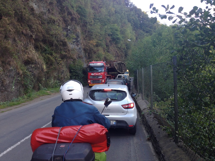 Twenty minutes later we were refreshed enough to jump back on the bikes and head on out. After sometime we found ourselves following the D1 into Revin. On the other side of that town and still riding through the hills, we, along with several cars up front got waved down by a Police official and motioned to stop as up ahead a wide load was doing towards us.