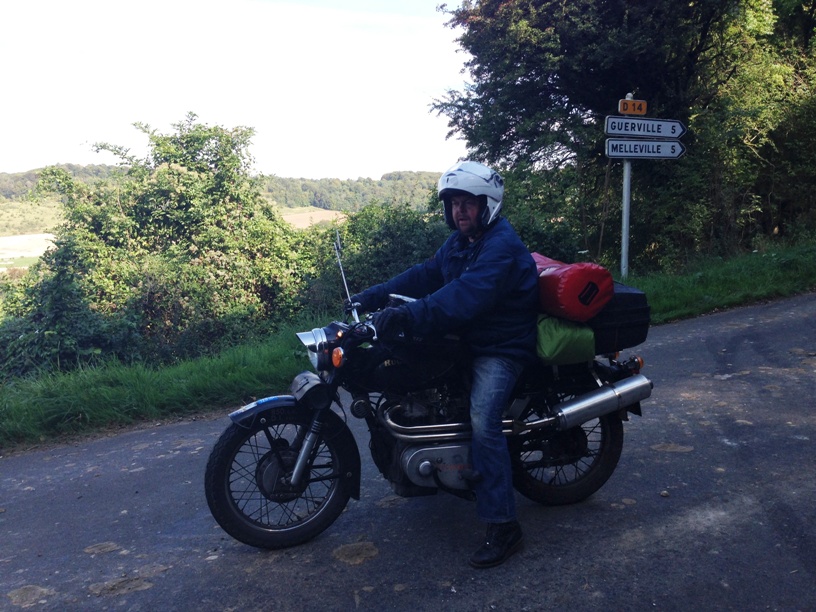 We get off the main routes choosing instead the more minor D936 to Oisemount before going South to Blangy. Then we climb up the wooded hill to Gamaches, narrow and twisty roads through the trees where, unexpectedley, a walker stops us at a Y junction. He is an old guy carrying a shooting stick that converts to a chair. He talks briefly with Jeff and then bends down to lift the flap of my brothers tank bag to reveal the motorcycles name. He tells Jeff that he once owned a Norton Dominator, the same bike our Father took over to the continent all those years ago.