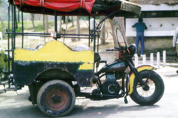 I'm told the three-wheeler is a Harley-Davidson Servicar. Originally powered by a 750 side valve motor, same as used in the WLA. This one has clearly been fitted with some sort of Diesel engine. The Picture is from India.